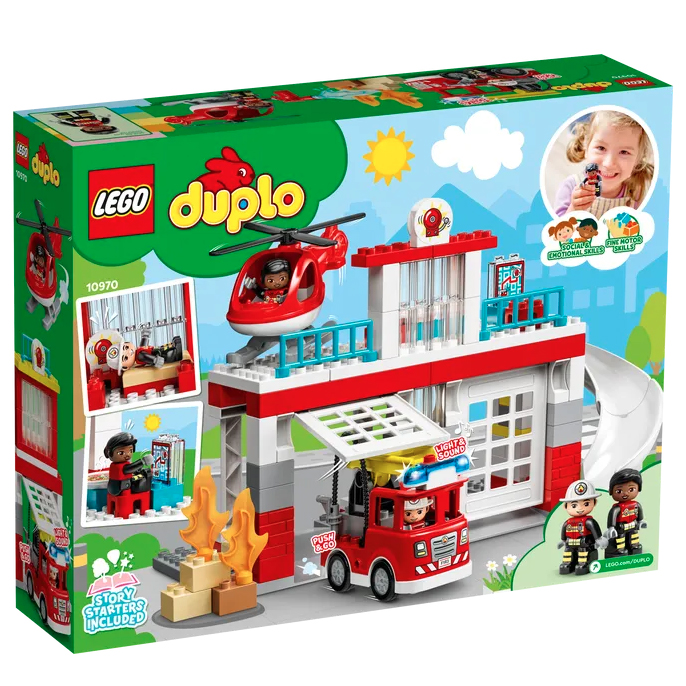 Tým požárníků sviští dolů po skluzavce, nasedá do hasičského vozu a vyjíždí ven s blikajícími světly a zapnutou sirénou (baterie jsou součástí balení) velkými vyklápěcími dveřmi. Na střeše startuje vrtulník, aby se také mohl zapojit do mise. Až bude po všem, je čas na hasičské cvičení, zaslouženou pizzu a odpočinek v posteli – vše je připraveno na další rušný den. Sada určená speciálně pro předškoláky doslova překypuje herními možnostmi podporujícími rozvoj jemné motoriky, empatie a dalších důležitých dovedností. Děti se zároveň mohou bezpečným způsobem seznámit s prací hasičů.
