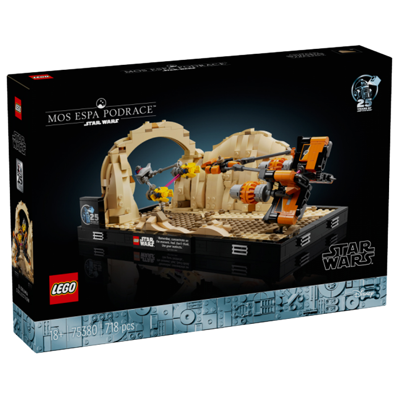 Zachyťte strhující okamžik se stavebnicí LEGO® Star Wars™ (75380) Závod kluzáků v Mos Espa – diorama pro dospělé. S touto sběratelskou stavebnicí probudíte svou Sílu a z kostek postavíte scénu, ve které se Anakin Skywalker ve filmu Star Wars: Skrytá hrozba řítí skrz Obloukový kaňon a pronásleduje svého protivníka Sebulbu.
