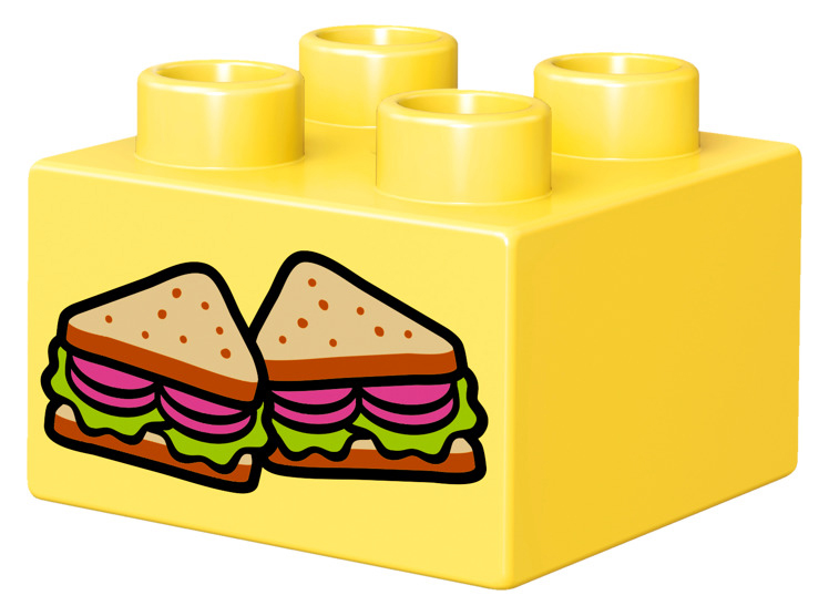 Polybag (pytlíčkový set), který obsahuje jednu zelenou kostičku, jednu žlutou kostičku s potiskem sendviče a 1 figurku - může být policista, paní v růžovém, holčička s králíčkem na tričku, a nebo černá kočička (dědeček v žádném z pytlíčků není).